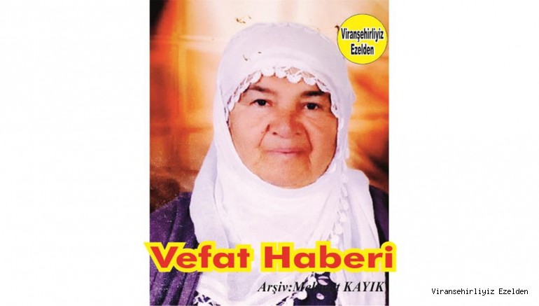 Viranşehir'li Hemşehrimiz AYYILDIZ Ailesinden; Merhum Aslan AYYILDIZ'ın Eşi Cemal AYYILDIZ, Mehmet AYYILDIZ, Murat AYYILDIZ, Ferhat AYYILDIZ, Süleyman AYYILDIZ, Bayram AYYILDIZ ve Turan AYYILDIZ'ın Anneleri Sultani AYYILDIZ Vefat Etmiştir.Taziyesi Viranşehir Kale Mahallesi Şehmusoğlu Taziye evinde yapılacaktır. İrt.: Süleyman AYYILDIZ 0541 871 22 26