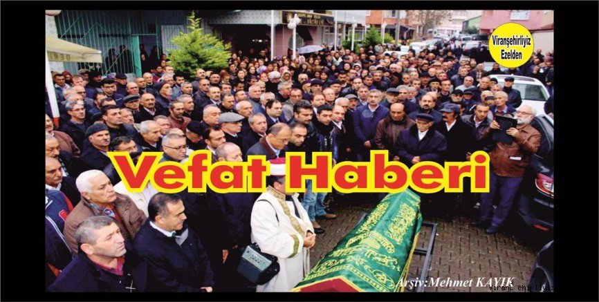 Viranşehir'li Hemşehrimiz CANPALAT - BAYRAM Ailesinden; Hacı Hüseyin Bayram’ın Kızı, Abbas Bayram’ın Kızkardeşi, Osman Bayram, Abdullah Bayram Hacı Fethi Bayram ve Fahri Bayram’ın ablaları, Ramazan Canpolat ve Nuri Canpolat’ın Anneleri Revhiye Canpolat(Bayram) Viranşehir’de Vefat etmiştir. Cenazesi Bugün 19 Nisan 2024 Cuma Bugün Toki Camisinde Öğlen Cuma Namazına Müteakkip Yeni Mezarlıkta Defin Edilecektir. Taziyesi Viranşehir Kale Mahallesi Hacı Menduh Şehmusoğlu Taziye Evinde Yapılacaktır. İrtibat Oğlu Ramazan Canpolat : 0507 755 91 01