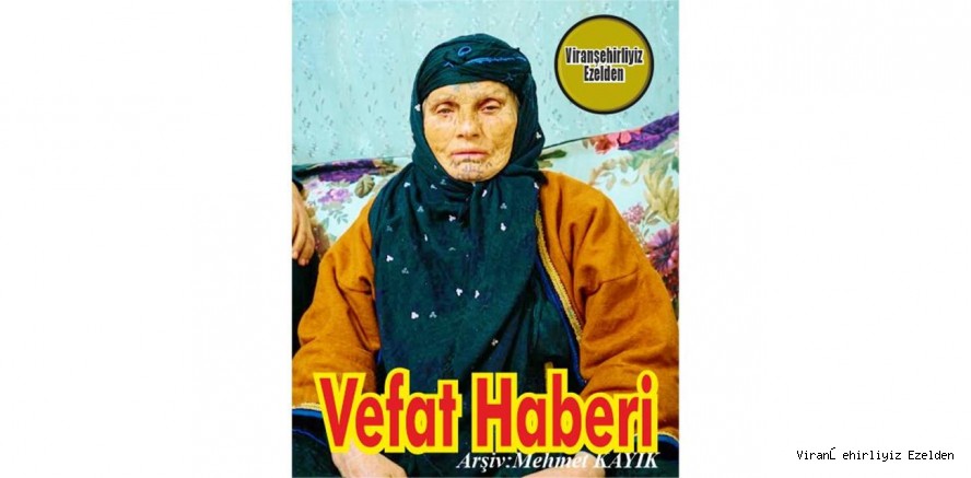 Viranşehir'li Hemşehrimiz GÜNEŞ(KANAR) Ailesinden; Hacı Seydo Güneş’in Eşi, Hacı Mehmet Nur Güneş(Hemenur) ve Şeyhali Güneş’in Anneleri, Mehmet Kanar, Mahmut Kanar ve Hacı Ahmet Kanar’ın Kız Kardeşleri, Hacı Zeyno Güneş Viranşehir’de Vefat etmiştir. Taziyesi Viranşehir Yenişehir Mahallesi Hacı Zahra Zencirci ve Hacı Mahmut Zencirci Taziye Evinde Yapılmaktadır. İrtibat: 05…